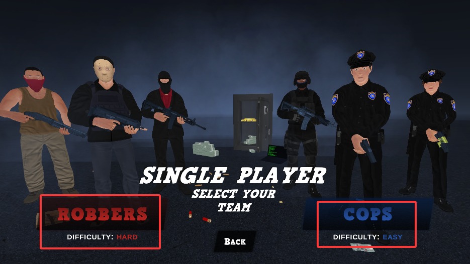 2、提供“警察”与“匪徒”两大对立阵营供玩家自由选择,双方拥有不同的初始武器与战术定位。玩家既能体验正义执法的使命感,也能感受作为反派的颠覆性策略乐趣。