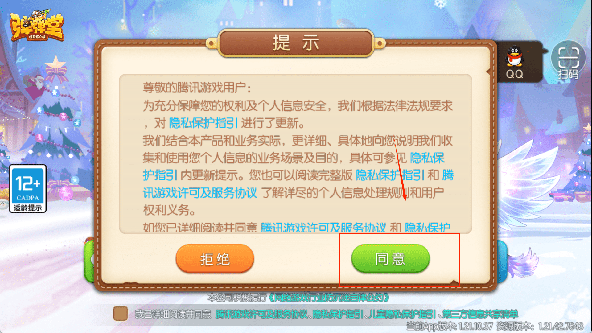 1、一进入游戏,那个关于隐私指引的提示框就会弹出来,背景是节日气氛很浓的场景。你需要做的是认真看完文字说明,然后在弹窗底部找到“同意”按钮并点击,这样才能进行下一步。
