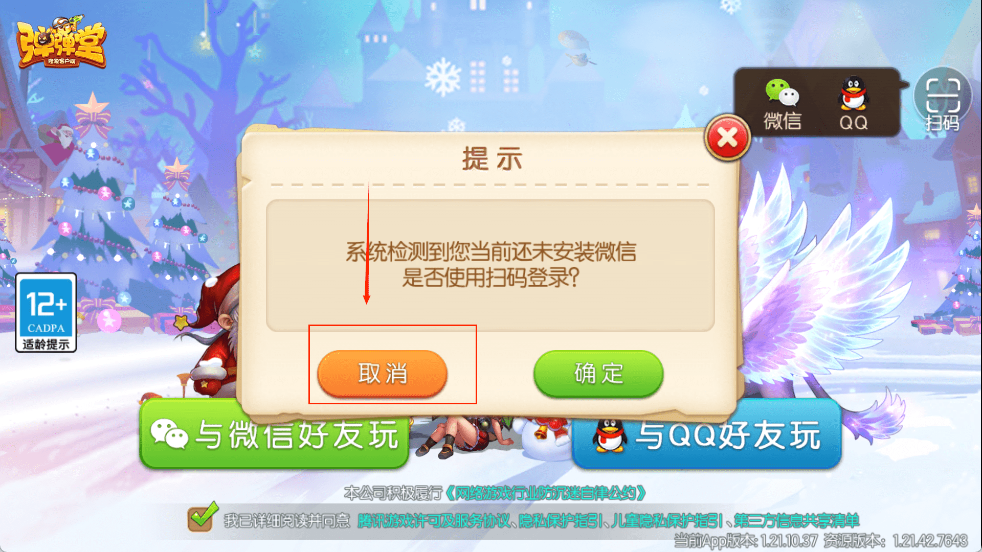 3、之后进入登录主页面,场景是雪地圣诞风格。在开始前,先确认自己年满12岁,因为左上角有适龄提示。然后,在画面下方选择“与微信好友玩”或“与QQ好友玩”来进入游戏。