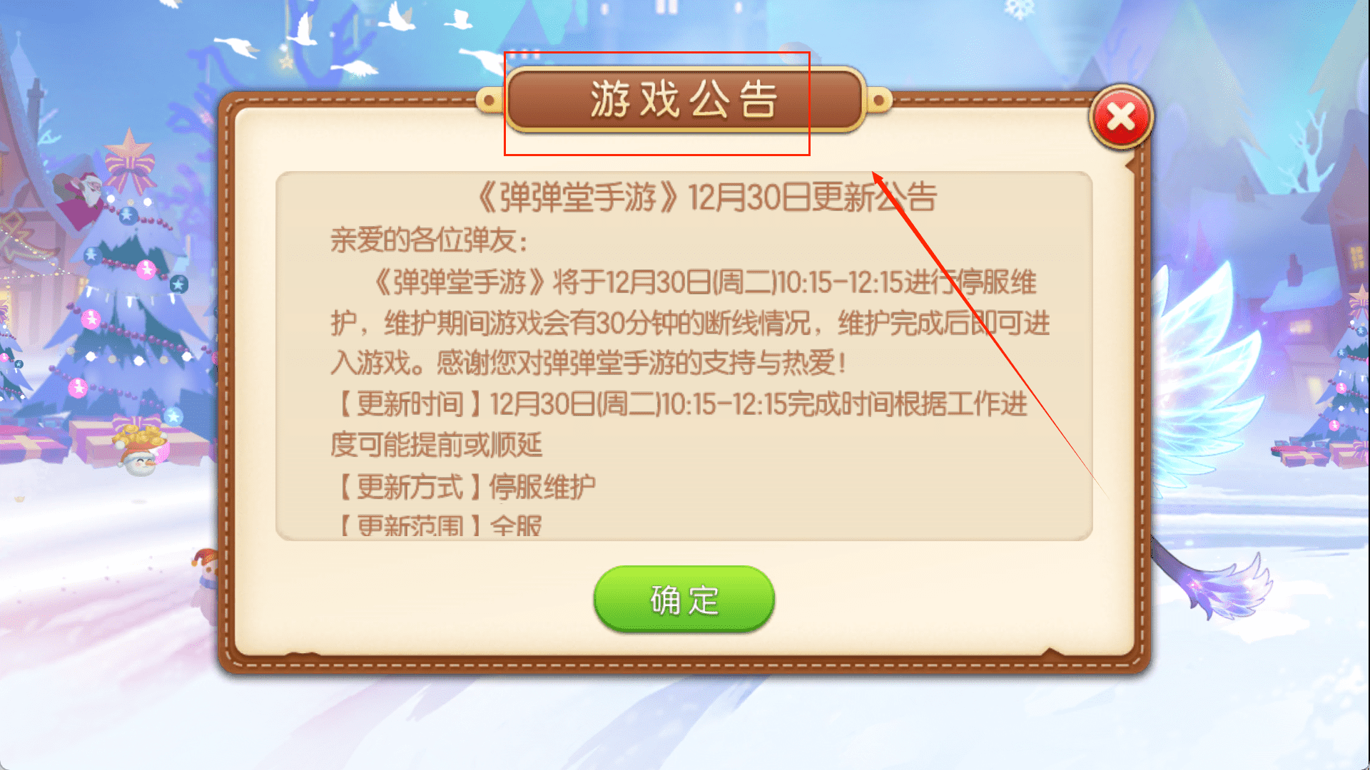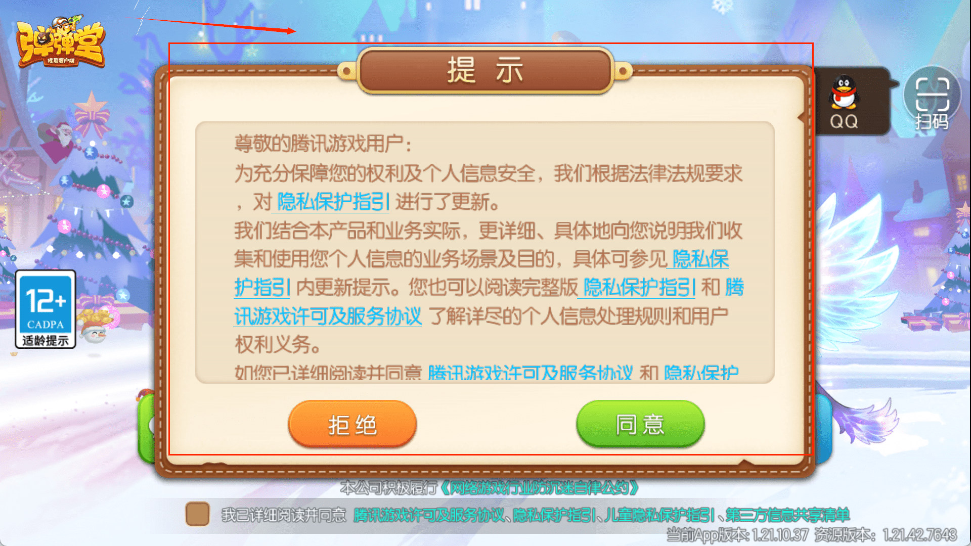 1、游戏一开始,你会先看到隐私保护指引的提示,背景是城堡和圣诞树。你需要做的操作很简单,就是仔细阅读上面的文字,然后在提示框底部点击那个显眼的绿色“同意”按钮。