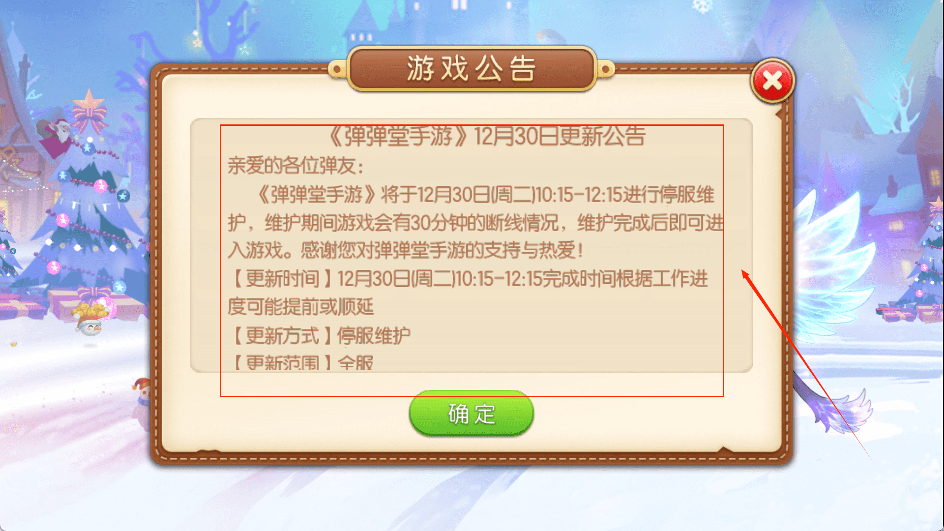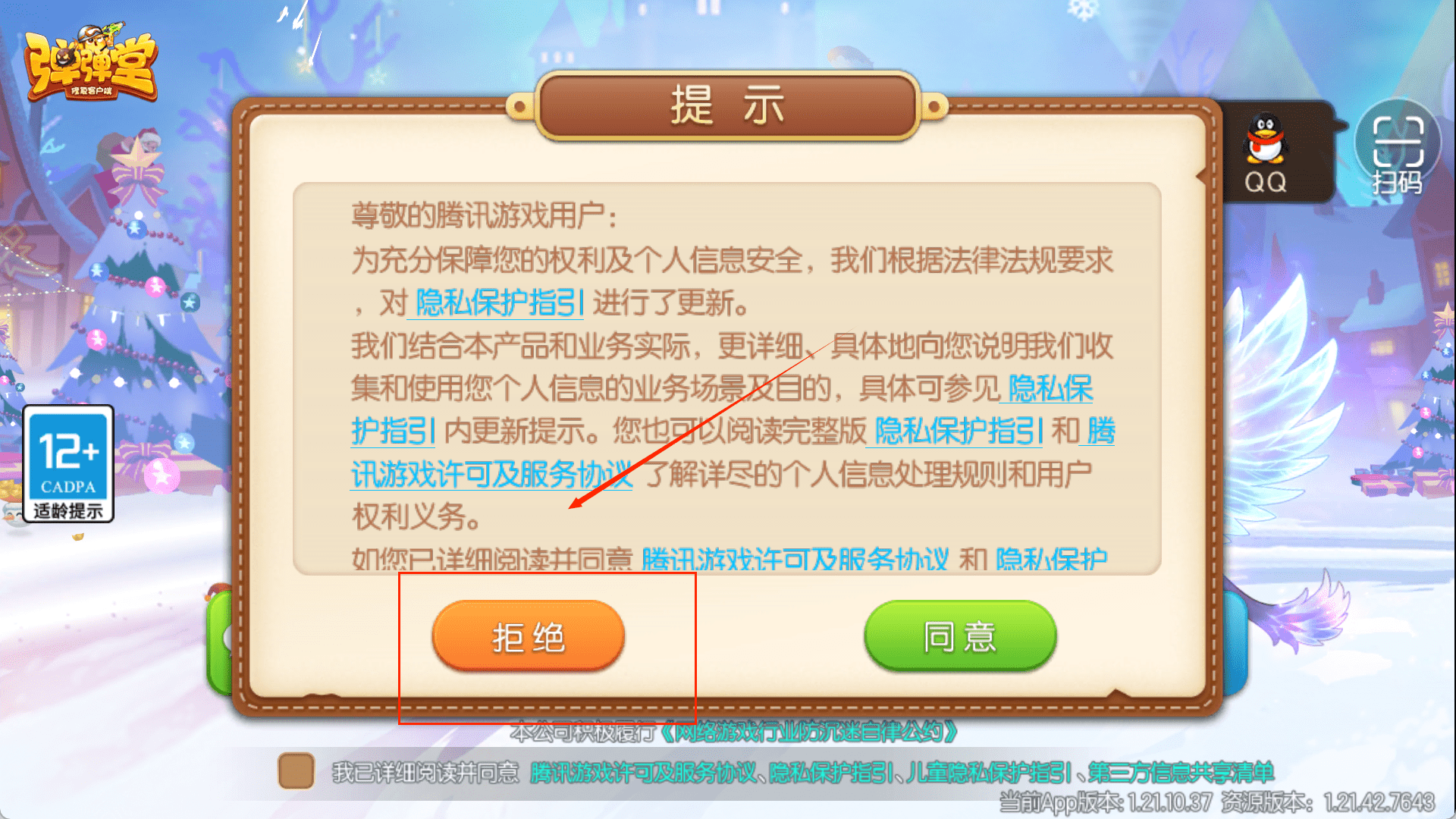 1、启动《弹弹堂手游》,首先会出现一个带“提示”字样的窗口,讲的是隐私指引更新。这个窗口背景很梦幻,有雪花飘落。你需要操作的是,在窗口底部点击绿色的“同意”按钮来确认。