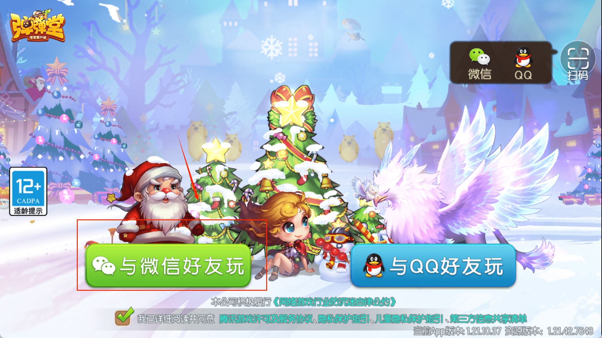 3、来到登录主界面,画面中央是游戏角色。在登录前,先留意界面上的“CADPA适龄提示”标识。然后,在屏幕靠下的位置,选择“与微信好友玩”或“与QQ好友玩”其中之一来开始登录。
