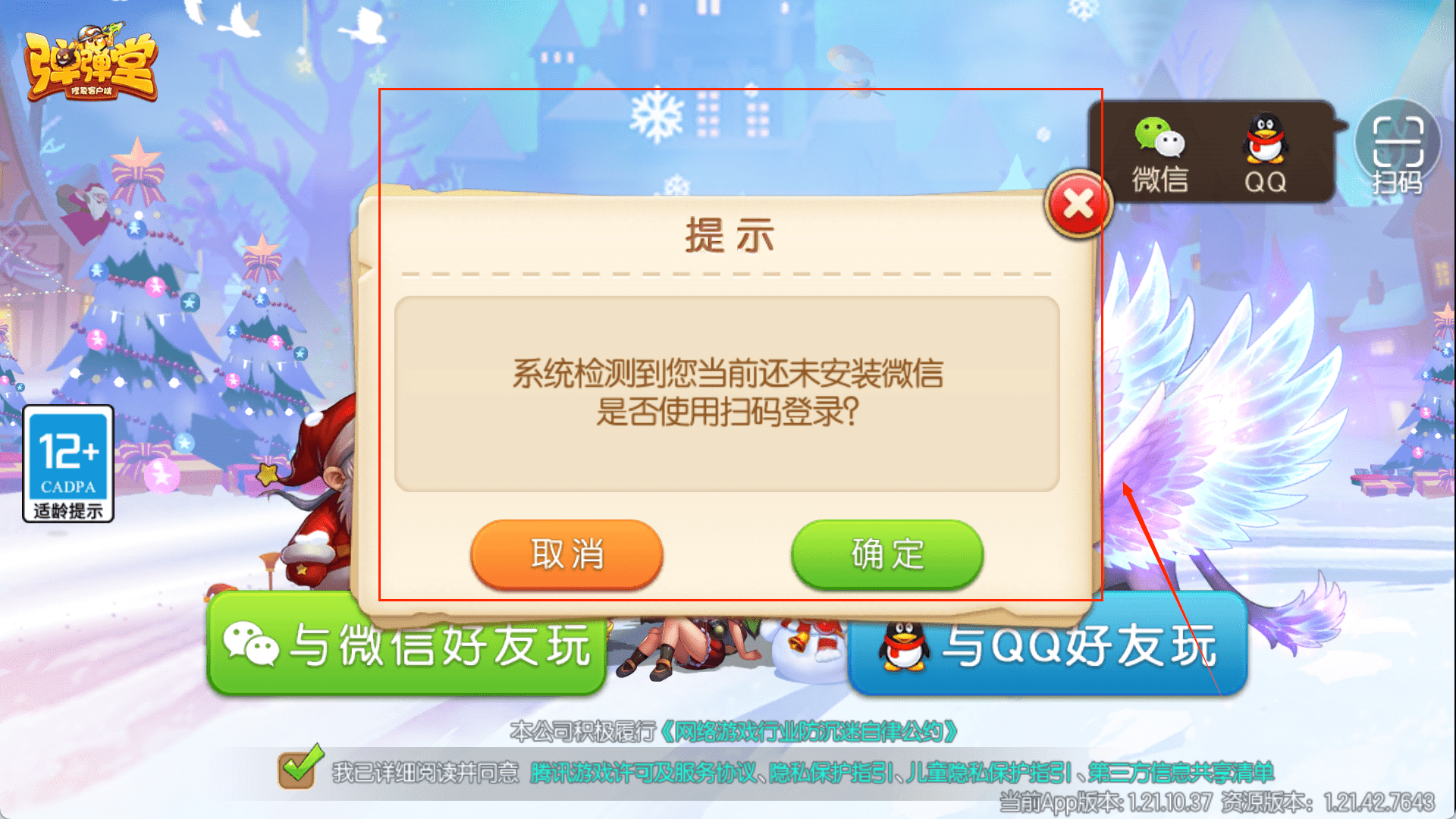 3、现在你看到了游戏的登录主场景,非常绚丽。第一步是先确认自己符合年龄要求,因为游戏标注了“12+”。第二步是选择登录方式,点击底部对应的微信或QQ图标按钮。
