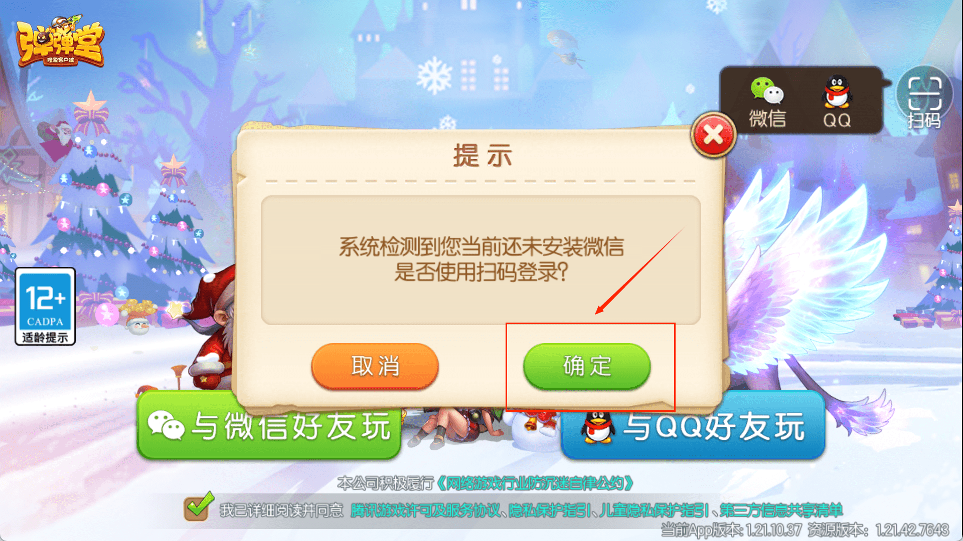 3、登录界面终于展现在眼前,背景是雪地和装饰物。在点击登录按钮前,请先注意游戏左上角的适龄提示信息。之后,在界面下方,选择你熟悉的社交平台按钮进行登录。