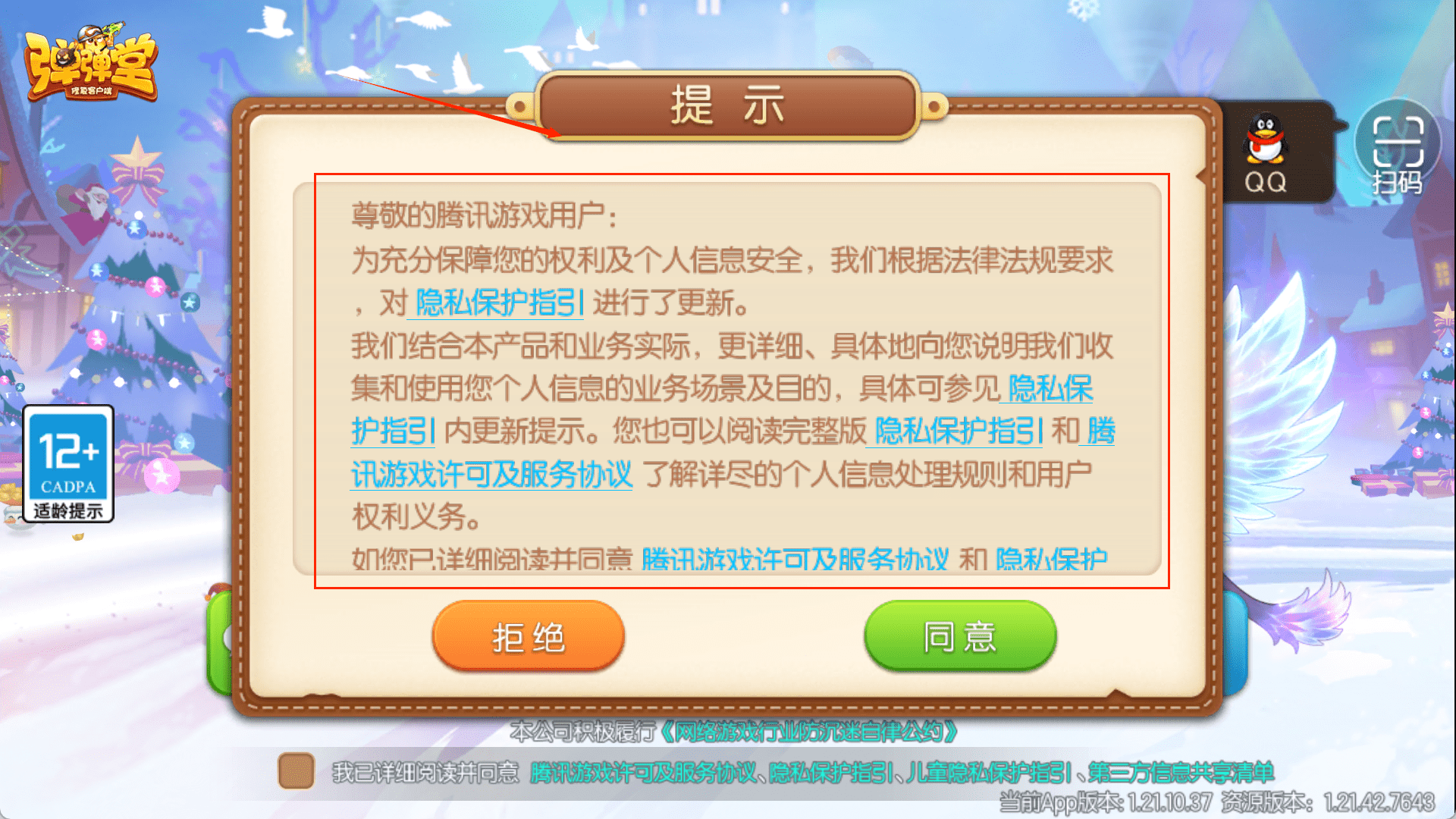 1、游戏启动后,首先展示的是隐私更新确认框,设计得挺别致。你应该花点时间看看框里写了什么,然后在确认框的底部区域,找到那个表示你同意的按钮,并用手指点击它。