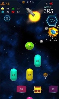 4、游戏中玩家要在太空中发射大炮,用炮弹的不断弹射摧毁一个个陨石。