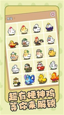 口袋鸡与奇异蛋是一款模拟经营的游戏,你的任务是扮演一个养鸡大户,然后通过饲养各种各样的小鸡,让这些小鸡快速成长,每天要收获大量的鸡蛋,提高养鸡场的经营效率,多种模式应有尽有,扩大知名度,获得更多的金币奖励,开启更多的养鸡场,有建造系统,还有经营系统等等。