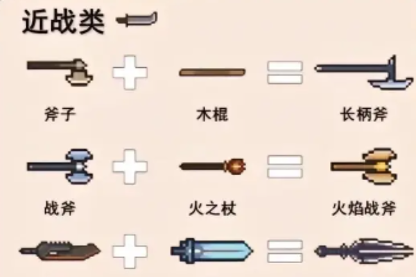 4、近战类:斧头+木棍=长柄斧,战斧+火之杖=火焰战斧。光剑蓝+光剑红=光剑紫。