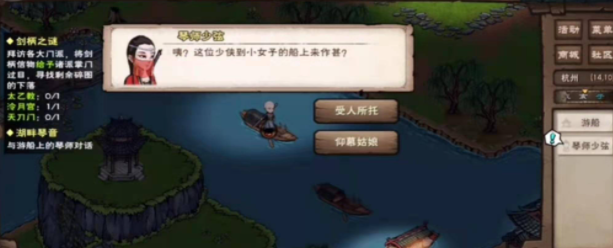 2、然后我们与琴师少弦对话,获得渔舟唱晚琴谱,在天亮之后去苏堤找书生复命选择【爱莫能助,获得声望和字帖】。